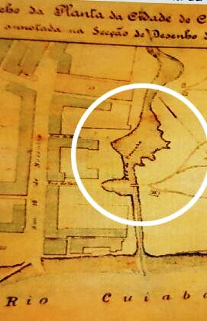 Numa planta baixa de Cuiabá, antiga de 1892 é possível ver o córrego em seu estado natural tendo inclusive no seu curso uma grande barragem de contenção ou lago natural para resistir as fortes chuvas.