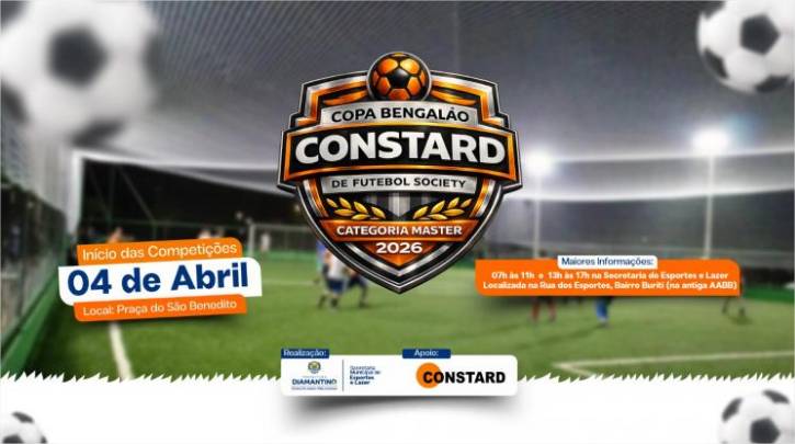 A Prefeitura de Diamantino, por meio da Secretaria Municipal de Esportes e Lazer, informa que a abertura da Copa Bengalão Constard de Futebol Society, prevista para o último sábado (14.03), foi transferida para o dia 04 de abril, às 19h, no campo society do bairro São Benedito. A alteração ocorreu em razão das chuvas registradas no município nos últimos dias.