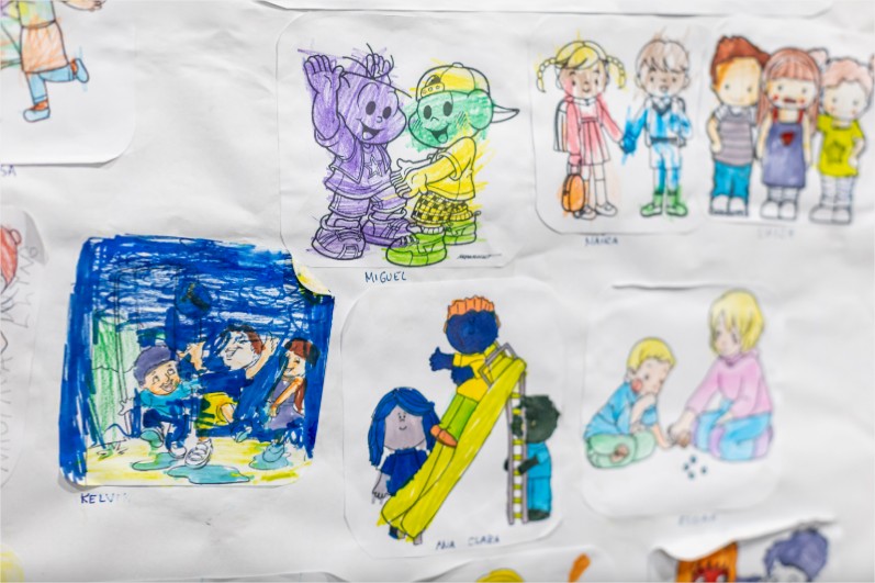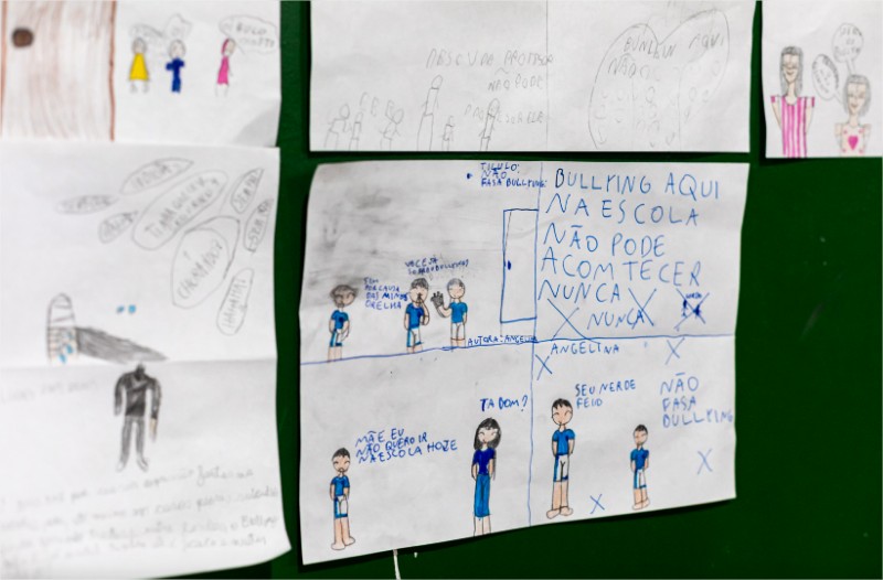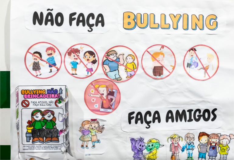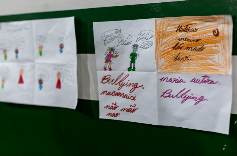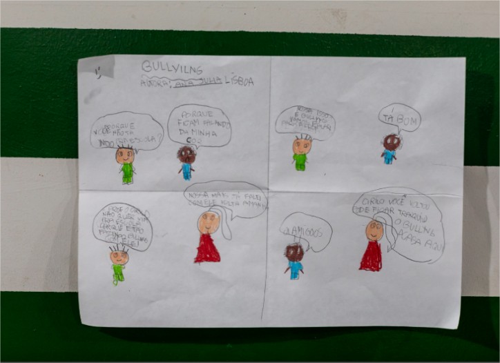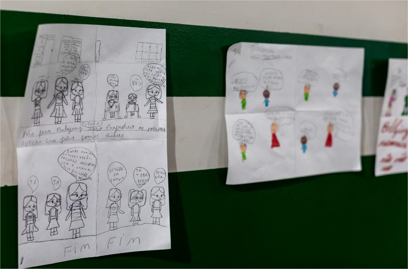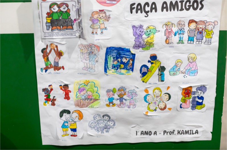 Há também cartolinas exibindo desenhos com ideias de combate ao bullying e cyberbullying feitos pelos estudantes da 1ª série, que têm seis anos.