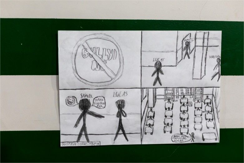 Trinta crianças matriculadas no 4º ano da EMEB (Escola Municipal de Educação Básica) Agostinho Simplício, localizada no bairro Poção, em Cuiabá, todas com 9 anos de idade, criaram desenhos durante as aulas de Educação Artística, expondo suas contrariedades às práticas de bullying e cyberbullying.