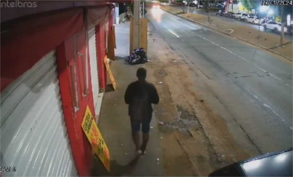 Na imagem, o suspeito é visto de costas por uma câmera de segurança do açougue onde trabalha, no bairro Alvorada. Ele passa vestindo um casaco com uma sacola nas mãos e, de forma muito tranquila, segue o caminho sem nenhum senso de urgência.