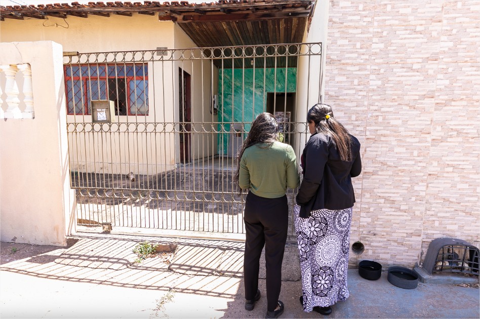 A foto mostra a equipe da Secretaria Municipal de Assistência Social durante visita domiciliar.