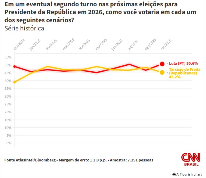 Em eventual cenário de segundo turno nas eleições de 2026, o presidente Luiz Inácio Lula da Silva (PT) teria 50,6% das intenções de voto, contra 45,2% do governador de São Paulo, Tarcísio de Freitas (Republicanos). É o que aponta levantamento AtlasIntel/Bloomberg divulgado nesta quarta-feira (17).