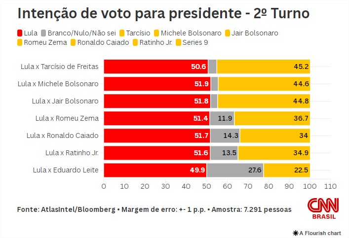 A pesquisa de hoje testou ainda outros seis eventuais cenários de segundo turno entre Lula e nomes da direita, como o casal Jair e Michelle Bolsonaro, ambos do PL. Em todos estes quadros, o petista tem vantagem sobre os adversários (confira os detalhes a seguir).