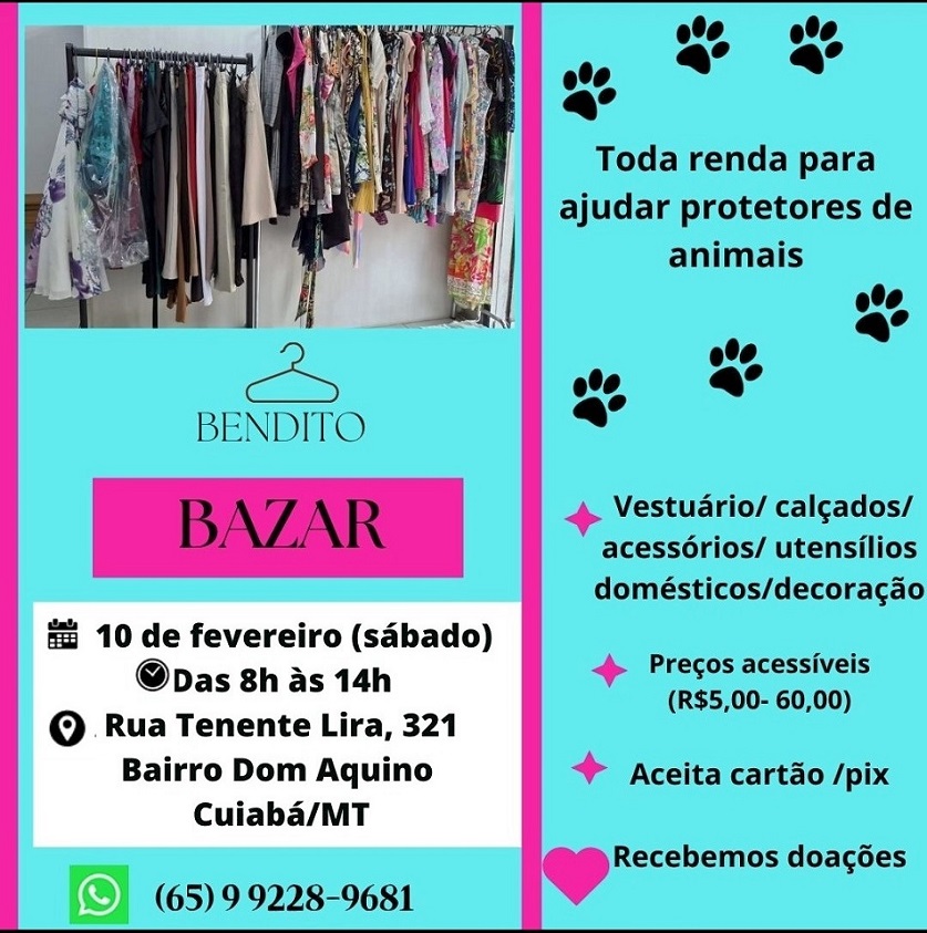 Portanto, não perca a oportunidade. O Bendito Bazar é a sua oportunidade de contribuir para a causa animal e, por consequência, evitar o sofrimento de inúmeros cães e gatos, em Mato Grosso.
