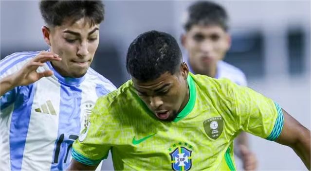 Brasil e Argentina empataram em 1 a 1, nesta quinta-feira, em jogo da quarta rodada da fase final do Sul-Americano Sub-20. Echeverri marcou, em cobrança de pênalti de cavadinha, o gol argentino. No segundo tempo, Rayan, do Vasco, empatou a partida após bom passe de Igor Serrote, do Grêmio. Assim, a definição do título fica para o próximo domingo, na quinta e última rodada.