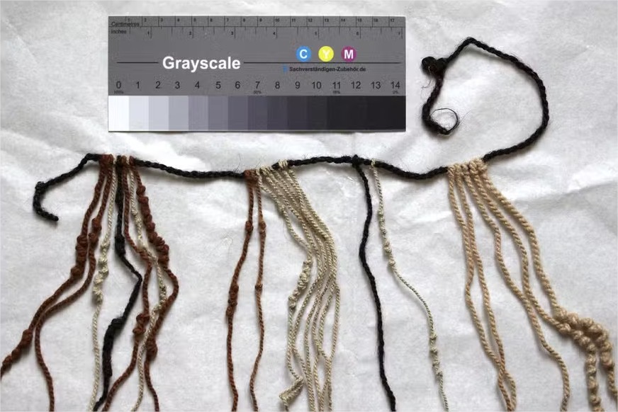 Ao contrário do padrão de cordões feitos de lã de lhama ou alpaca, este cordão principal era feito inteiramente de cabelo humano: um fio de 104 centímetros, dobrado e torcido. A equipe responsável pelo achado acredita se tratar de um material com profundo significado simbólico no mundo andino, carregando a “essência” de quem o doou.