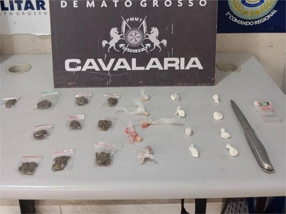 Policiais militares da Cavalaria prenderam um homem, de 21 anos, por tráfico ilícito de drogas, no final da tarde desta segunda-feira (12.1), em Cuiabá. Com o suspeito, preso em flagrante, a PM apreendeu 18 porções de substâncias análogas a maconha e cocaína.