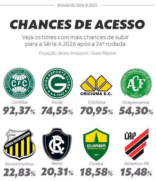 As quatro vitórias seguidas do Athletico-PR colocam a equipe de volta na luta pelo acesso à Série A ao fim da 26ª rodada da Série B. Se, antes dessa sequência, o time de Odair Hellmann tinha 1,31% de chance de subir, agora já são 15,48%. O Furacão é o oitavo time com maior possibilidade de estar na primeira divisão em 2026, embalado pela vitória por 3 a 2 em cima da Chapecoense em Santa Catarina.