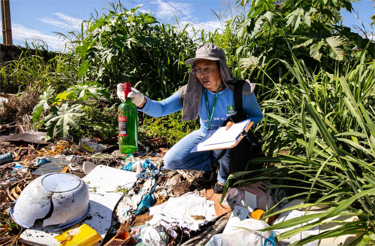 A imagem mostra uma agente de saúde durante uma fiscalização em um terreno baldio. A servidora segura uma garrafa de vidro nas mãos, que serve como criadouro do mosquito da dengue. Também é possível observar muito lixo descartado de forma irregular no local.