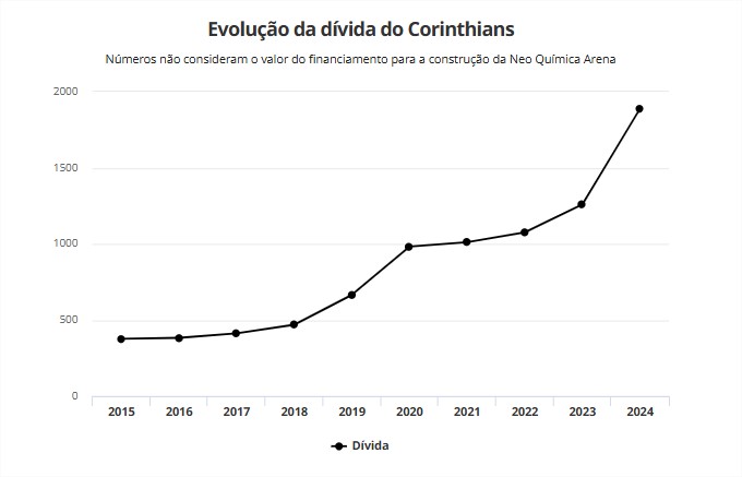 A dívida do Corinthians, que já era alta, disparou e chegou a R$ 2,5 bilhões, dos quais R$ 1,8 bilhão é do clube e mais R$ 668 milhões do financiamento da Neo Química Arena. Isso representa um aumento de cerca de R$ 600 milhões em apenas um ano. Ao final de 2023, a dívida era de R$ 1,9 bilhão.