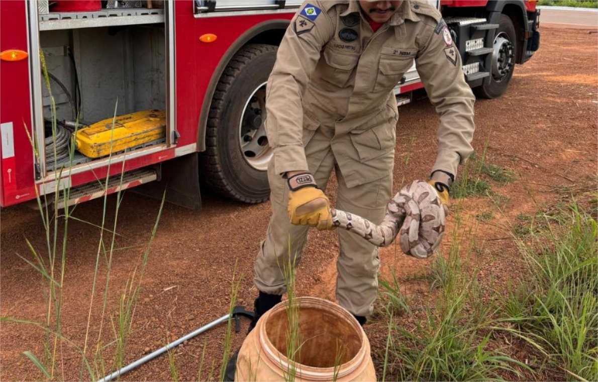 A equipe do 2º Núcleo de Bombeiros Militar (2º NBM) foi acionada e, ao chegar ao local, realizou uma inspeção, identificando uma jiboia (Boa constrictor), espécie não peçonhenta, com aproximadamente 1,8 metro de comprimento, enrolada no compartimento interno da lavadora.