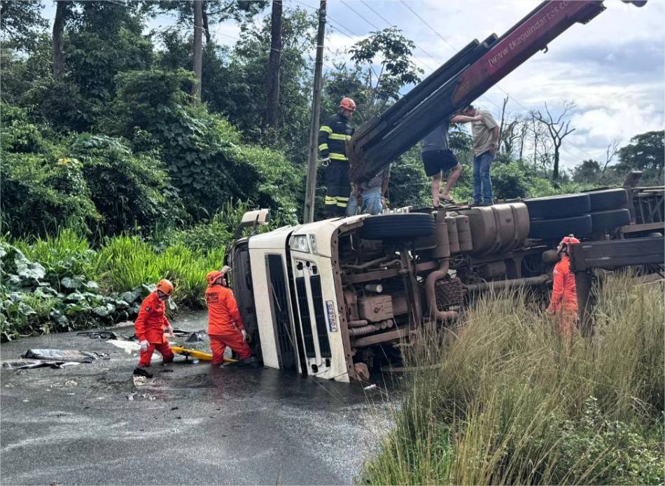 Com o tombamento do caminhão, houve o derramamento de resíduos de soja no acostamento da via. O material se misturou ao acúmulo de água do local, formando lama, o que dificultou o resgate da vítima, que estava consciente e orientada.