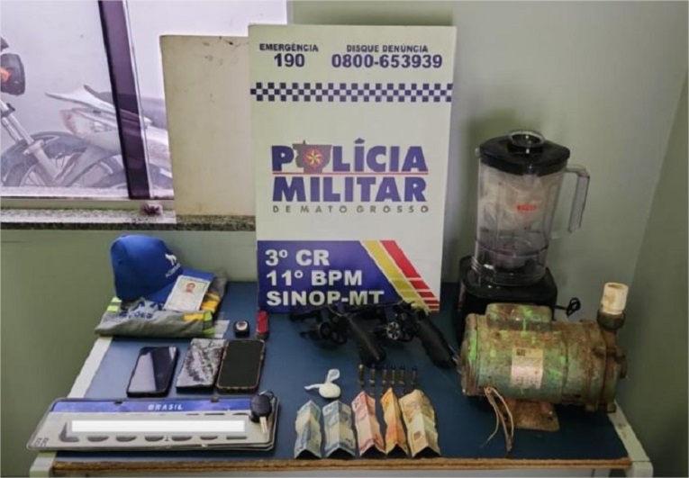 Armas, dinheiro, celulares e outros profutos apreendiso com suspeitos de sequestro. (Foto PM-MT)