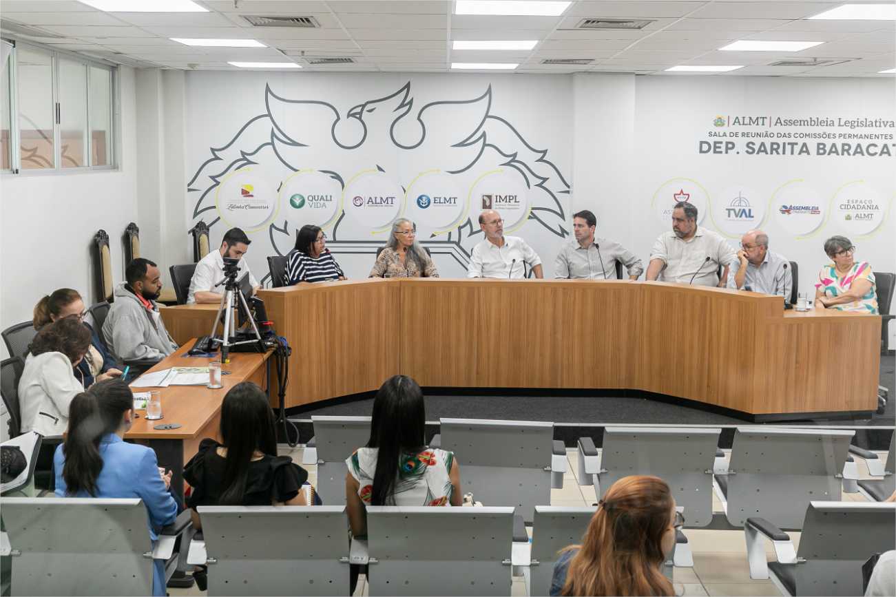 A imagem mostra um grupo de pessoas reunidas em uma sala de reuniões localizada na Assembleia Legislativa de Mato Grosso. O encontro discute temas relacionados à saúde mental, com a participação de profissionais da área. Todos estão dispostos ao redor de uma bancada de cor amadeirada, e as paredes da sala são brancas, com letreiros que identificam a instituição.