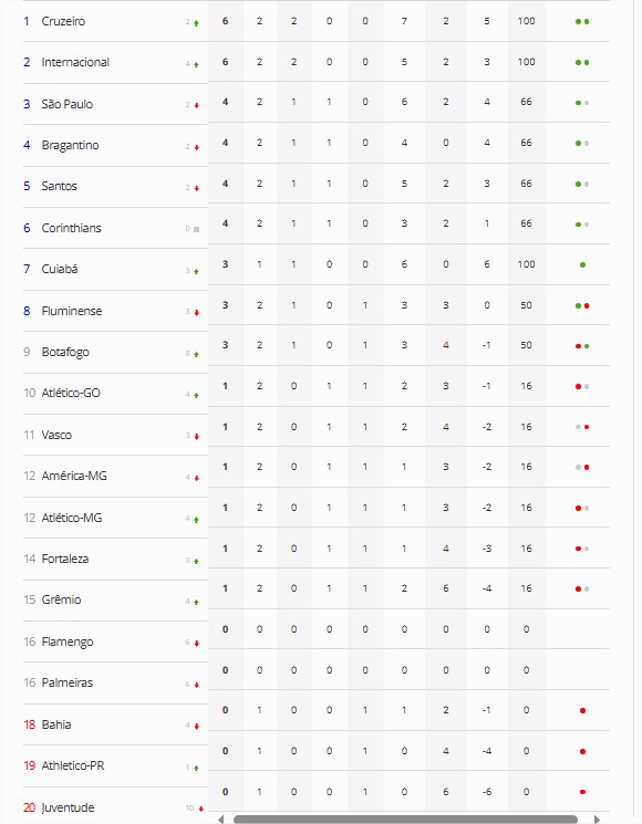 Veja como está a classificação após duas rodadas