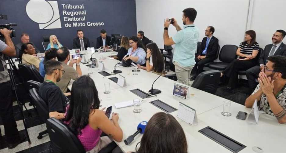 #PraTodosVerem: Foto principal que mostra uma sala de reuniões e, em uma ponta, próximo a uma parede azul com a marca do TRE-MT em destaque, estão representantes do Tribunal, incluindo a presidente. De frente para eles, estão jornalistas e cinegrafistas, sentados ao redor de uma grande mesa. Ao final da matéria, tem uma galeria com mais fotos da coletiva.