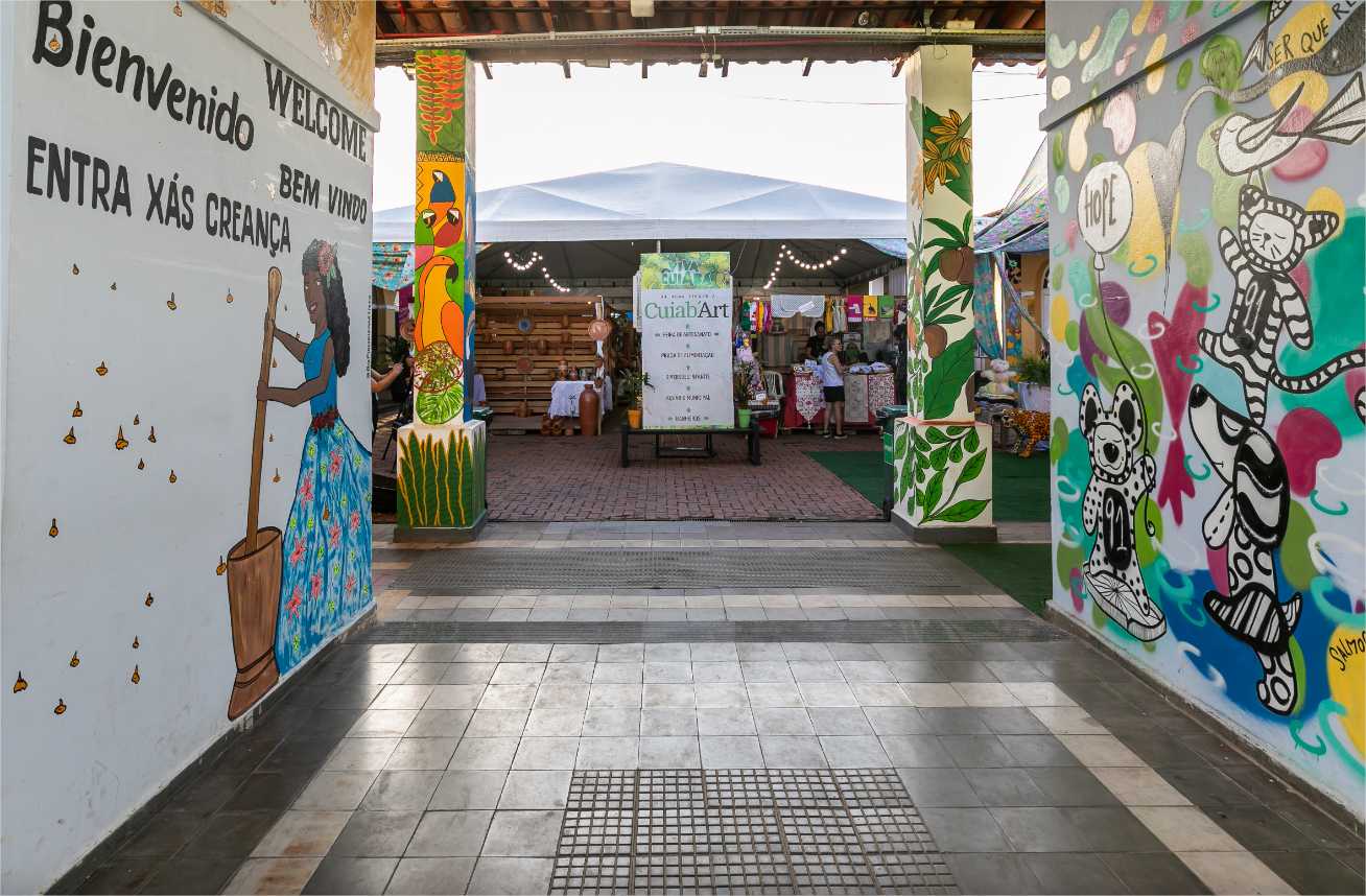 A foto mostra a entrada da Feira Cuiab’Art, localizada no Museu do Rio, região do bairro Porto, em Cuiabá.a