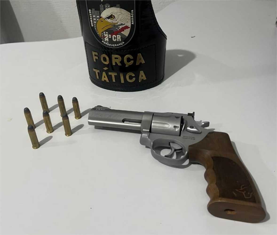 As equipes intensificaram o policiamento no município e flagraram o condutor de frente a uma residência, no bairro Jurumirim. Ao ser abordado e questionado sobre a arma, os policiais localizaram com ele o revólver e algumas munições. O suspeito e o armamento localizado foram conduzidos para delegacia.