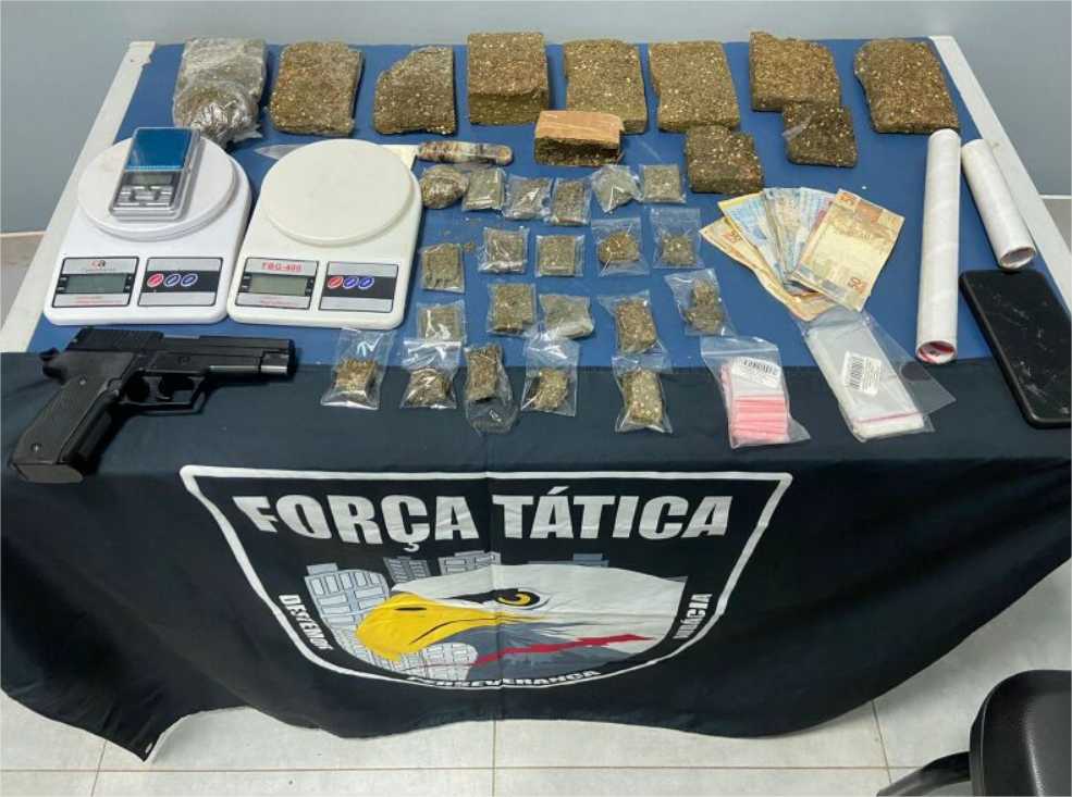 No quarto do suspeito, os policiais apreenderam porções e tabletes de maconha, um simulacro de arma de fogo e uma quantia em dinheiro, não informada.