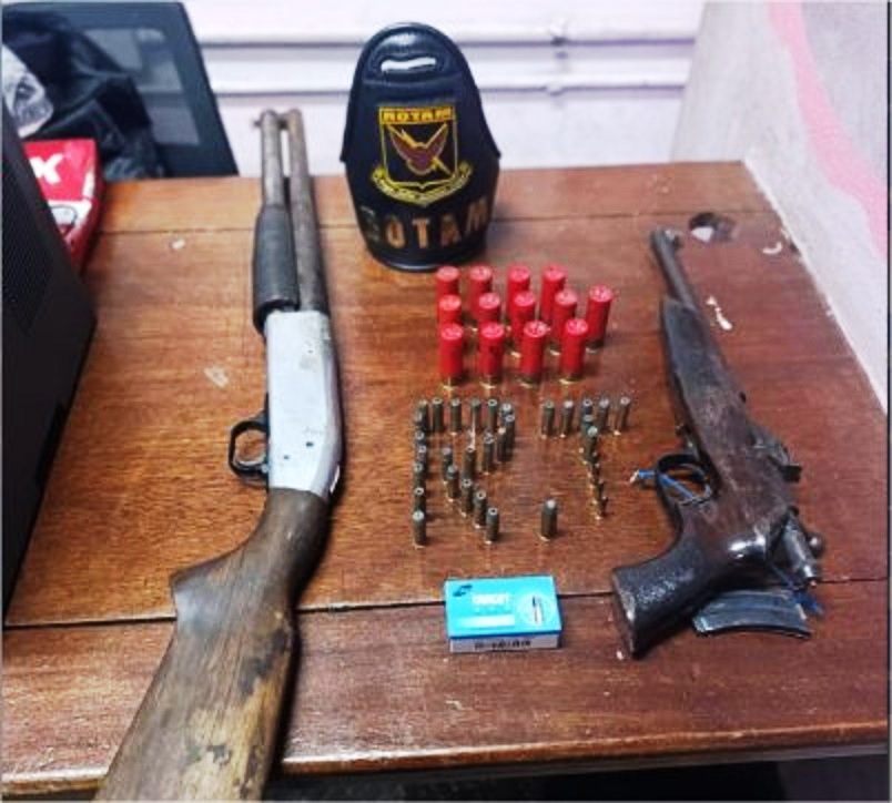 Ao todo, a polícia apreendeu uma espingarda calibre 12, uma garrucha calibre .22, 54 munições calibre .22, uma munição calibre .44, 13 cartuchos calibre 12 intactos e 28 munições calibre 38.