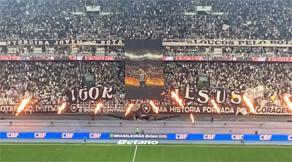 A torcida do Botafogo fez uma homenagem ao atacante Igor Jesus na despedida do jogador do Estádio Nilton Santos. Após a vitória sobre o Ceará por 3 a 2, os alvinegros estenderam um bandeirão na arquibancada e o nome do camisa 99, que está de saída.