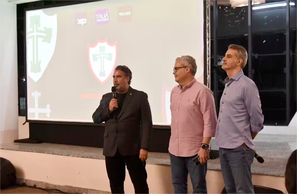 Castanheira (atual presidente da Portuguesa), André Berenguer e Alexandre Bourgeois, sócios da Tauá Partners — Foto: Dorival Rosa/ Portuguesa