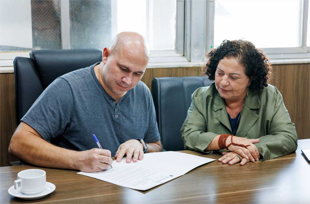 A foto ilustra o prefeito Abilio Brunini sentado numa cadeira de almofada preta, apoiado numa mesa de madeira, assinando um papel à caneta. Trata-se de um homem careca que veste camisa cinza. Ao lado, está a vereadora Baixinha Giraldelli. Trata-se de uma mulher de cabelo encaracolado cuja mão está apoiada na outra.