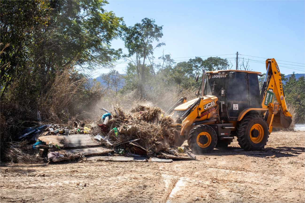 O trabalho contou com o suporte de um amplo maquinário, como caminhões-caçamba, pás carregadeiras, retroescavadeiras hidráulicas, plataforma e trator cortador de grama, estrutura essencial para lidar com o grande volume de entulho acumulado.