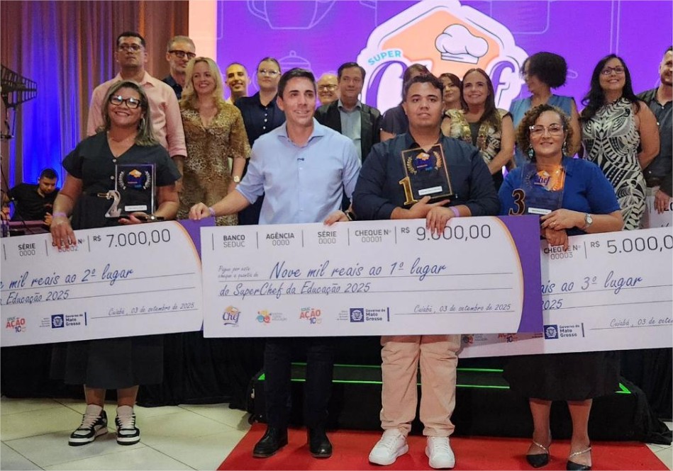 A cerimônia de premiação do concurso “SuperChef da Educação – Melhores Receitas 2025”, na noite desta quarta-feira (3.9), foi marcada por emoção, criatividade e muito sabor. Com o objetivo de valorizar o trabalho dos merendeiros escolares da rede estadual de ensino, o concurso é promovido pela Secretaria de Estado de Educação (Seduc-MT) e está na sua 3º edição.
