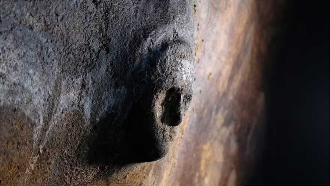 Uma cisterna da antiga cidade de Ptolemais, que fica na Líbia e é banhada pelo mar Mediterrâneo, guarda um rosto enigmático esculpido em argamassa hidráulica, que provavelmente foi feito no final do século 2.