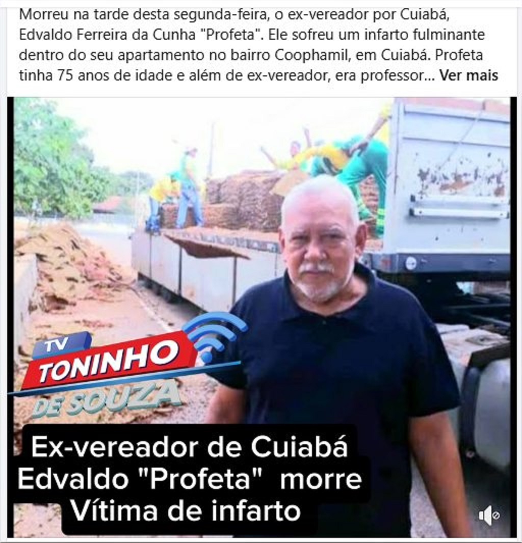 O professor Edivaldo Profeta Ferreira da Cunha, 75 anos, morreu na tarde desta segunda-feira, vítima de infarto fulminante, quando estava em seu apartamento no bairro Coophamil – um dos mais tradicionais da região Oeste de Cuiabá. O velório começa às 6 horas desta terça-feira (11), no saguão do Palácio Pascoal Moreira Cabral, por determinação da atual Mesa Diretora da Câmara de Cuiabá.