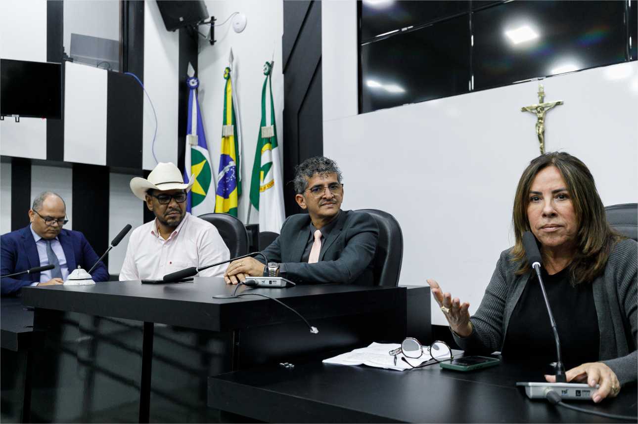 A imagem mostra quatro pessoas sentadas em uma mesa de frente para o público, sendo os vereadores Cezinha Nascimento, Eduardo Magalhães e Maria Avalone e o secretário Municipal de Cultura, Johnny Everson. Estão com microfones individuais. Ao fundo da imagem estão as bandeiras do Brasil, do Estado de Mato Grosso e de Cuiabá, demonstrando uma reunião em plenário, na Câmara de Vereadores.