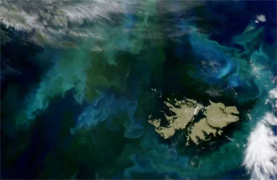 Satélites da Nasa capturaram uma a proliferação de fitoplâncton nas Ilhas Malvinas, no lado argentino da Patagônia, região que se estende também pelo Chile. O crescimento excessivo desse tipo de algas marinhas é responsável pela coloração verde que você vê na imagem acima, flagrada no dia 28 de dezembro.