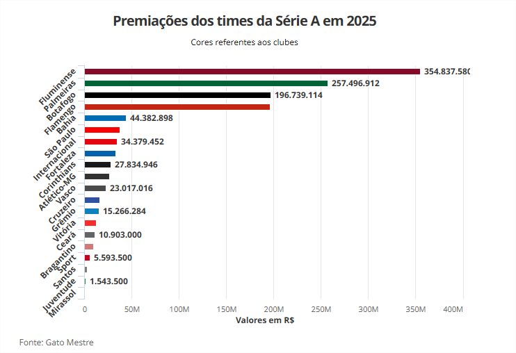 A diferença é de “apenas” (em termos de premiações) R$ 563 mil, mas suficiente para que o clube comandado por John Textor passe o rival. No total, o Botafogo acumula quase R$ 197 milhões, incluindo Copa do Mundo de Clubes, Libertadores, Copa do Brasil, Supercopa e Recopa.