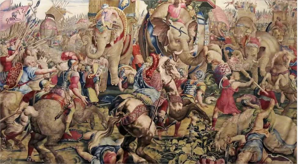 Tapeçaria ilustrando a Batalha de Zama, travada em 19 de outubro de 202 a.C. A disputa foi decisiva da Segunda Guerra Púnica. Nela, o exército da República Romana, liderado por Cipião Africano, derrotou as forças de Cartago lideradas por Aníbal. Logo após essa derrota, o senado de Cartago assinou um tratado de paz, terminando uma guerra de quase 20 anos — Foto: Wikimedia Commons