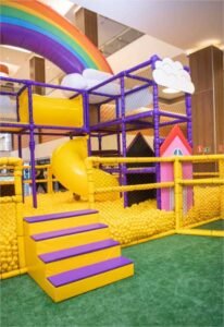 uma imensa piscina com mais de 200 mil bolinhas, escorregadores, balão pula-pula,