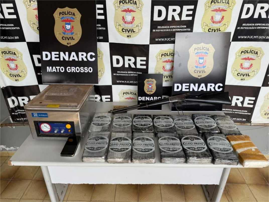 Confirmada a situação de flagrante, outra equipe da Denarc realizou a prisão do outro investigado, apontado como proprietário da droga, que foi localizado no shopping de Várzea Grande. Na residência do suspeito, foram apreendidos documentos, munições e anotações de contabilidade e comercialização da droga, além de uma máquina de embalar a vácuo com resquícios de entorpecentes.