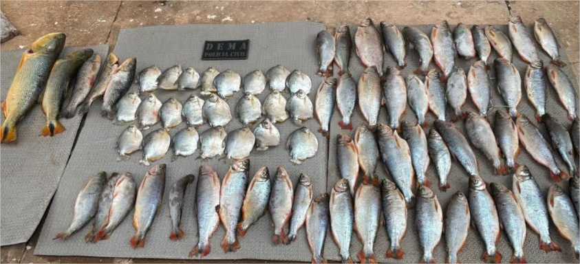 Durante os dias de fiscalização na região, foram apreendidos 83 exemplares de pescado de espécies piau, pacupeva e aquelas restritas pela Lei do Transporte Zero (nº 12.197/2023), como dourado e piraputanga, envolvendo armazenamento, transporte e comercialização irregular, além de uma arma de fogo (espingarda calibre .22) e 16 munições calibre .22.
