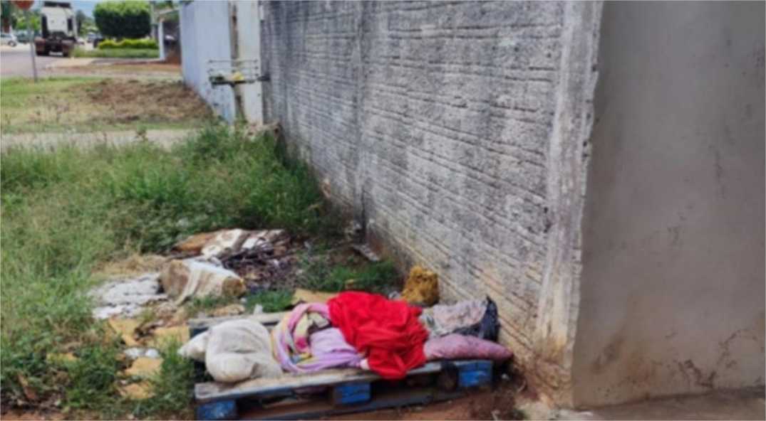 Com base nas informações, os policiais foram até o local, onde constataram a veracidade da denúncia, encontrando a vítima sentada do lado de fora da casa com urina e fezes nas roupas e com vários hematomas pelo corpo. A cama e demais pertences da vítima foram localizados em uma garagem aberta, onde ela passava a noite.