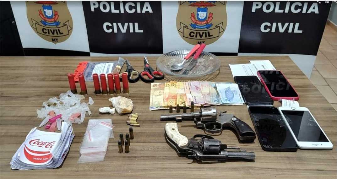 Durante o cumprimento dos mandados, foram encontrados dois revólveres calibre 32, uma pedra média de pasta-base, quatro pedras pequenas de pasta-base, uma de cocaína, oito munições calibre 22, 10 munições calibre 32 e sete munições calibre 28.