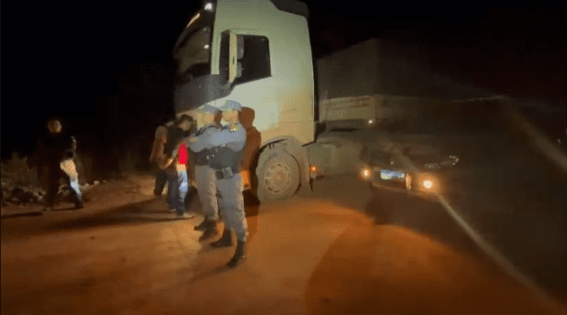 Os policiais foram até o local indicado pelo suspeito e encontraram o veículo de carga roubado. Os outros dois suspeitos foram encontrados dentro de uma caminhonete L200 Triton prata, também na região.
