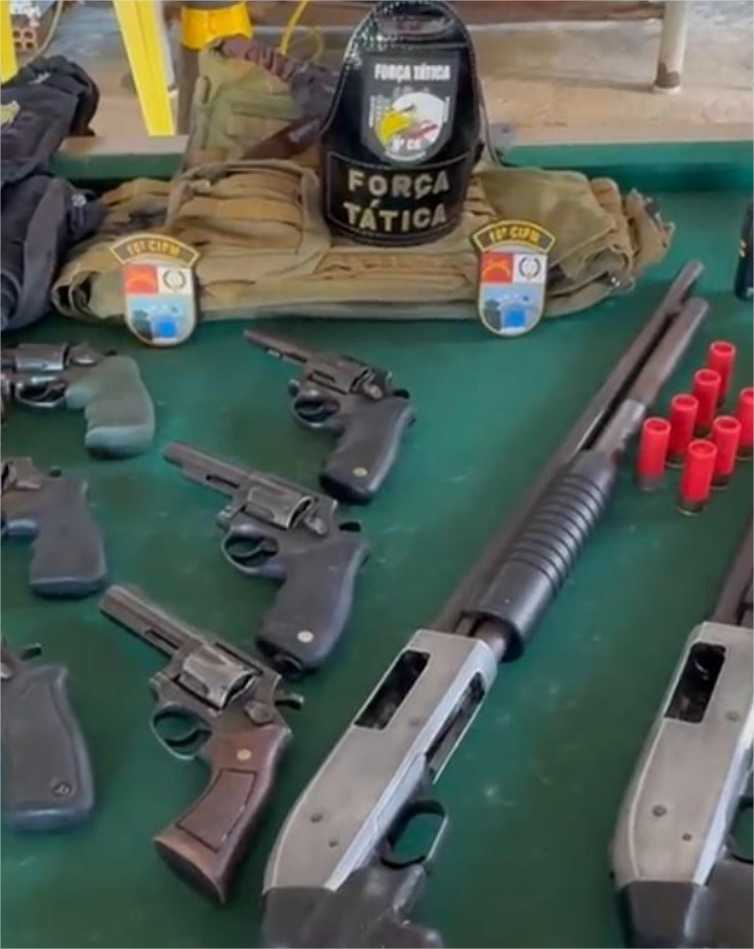 No local, a equipe policial realizou a abordagem e foram encontradas duas espingardas calibre .12, seis revólveres calibre .38, uma munição calibre .12, seis munições calibre .38 e 67 munições calibre .38, que pertence a outra empresa de segurança e estavam de posse dos suspeitos.