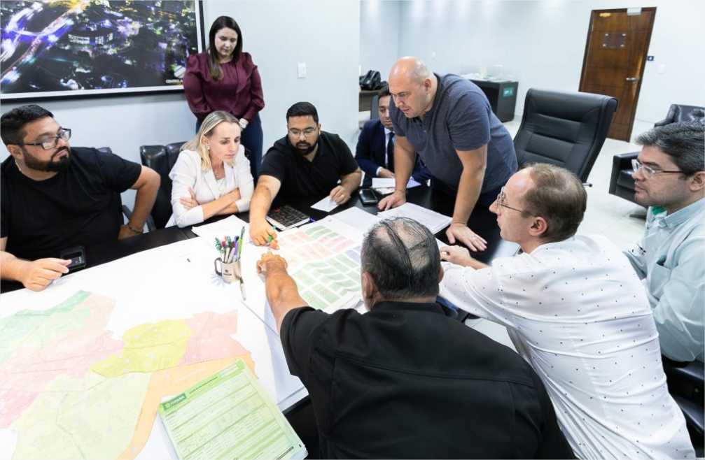 A imagem mostra o prefeito Abilio Brunini na frente da mesa de reunião olhando um mapa do Mercado do Porto. Ela usa cinza e preto. Ao redor da mesa também se encontra a vereadora Katiuscia Manteli usando branco, os secretários de Agricultura, Felipe Corrêa – usando camisa verde – e de Turismo, Fernando Medeiros, camiseta preta. Também estão ao redor os permissionários e servidores da Prefeitura de Cuiabá.