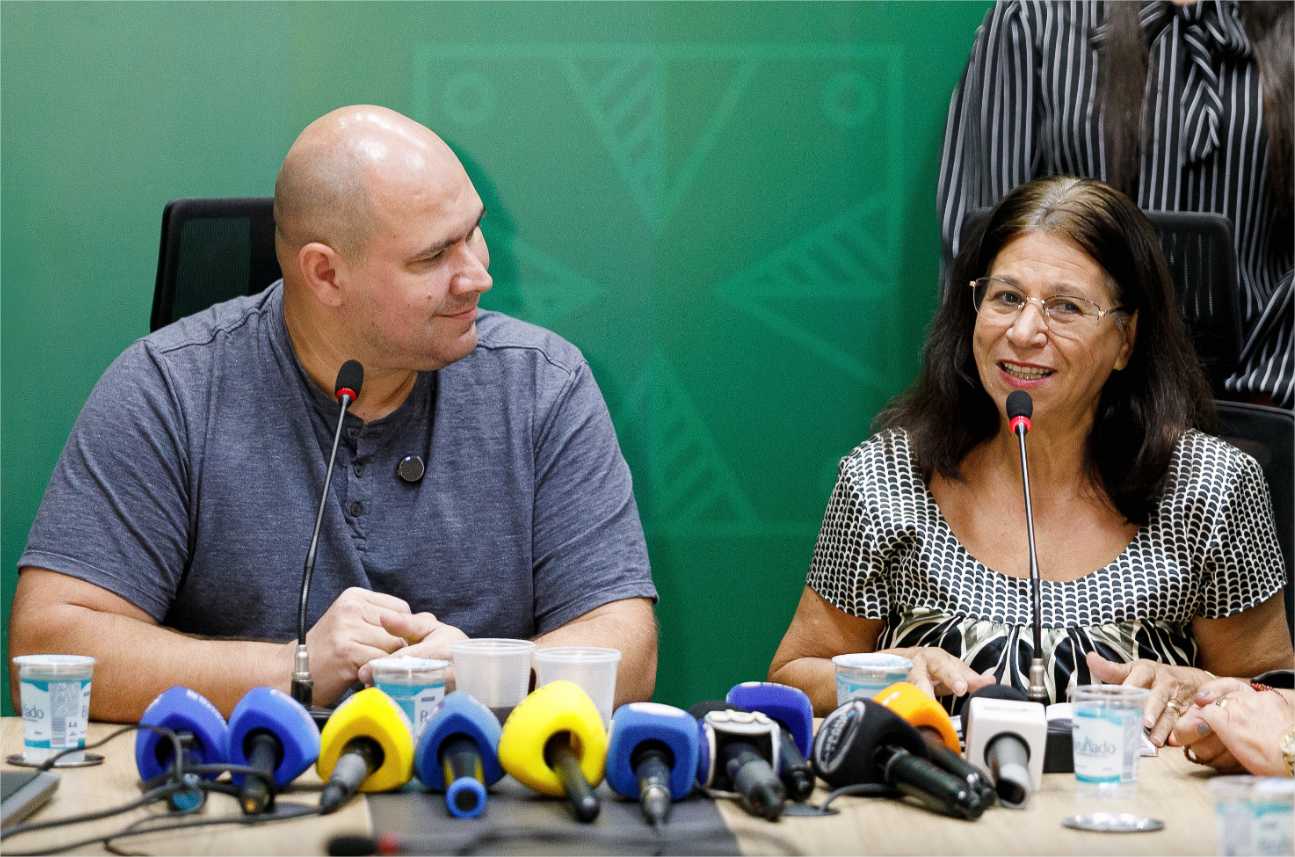 A foto mostra o prefeito Abilio ao lado de Solange, em uma coletiva de imprensa. Eles estão sentados com microfones de TVs à frente.