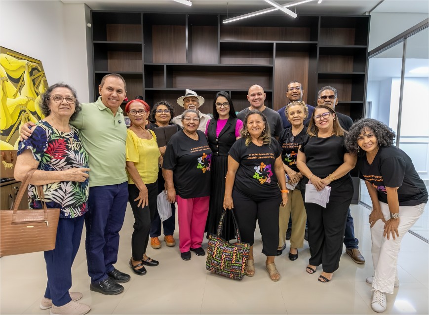 A imagem que ilustra a matéria mostra o prefeito Abílio Brunini, a vereadora e primeira-dama Samantha Iris, o vereador Dilário Alencar e representantes do Coletivo dos Centros de Convivência de Idosos durante reunião.