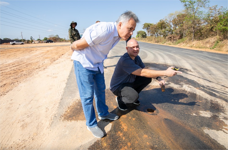 A vistoria contou com a presença do secretário de Infraestrutura e Obras, Reginaldo Teixeira e sua equipe técnica, além de representantes da construtora Nhambiquaras, responsável pela obra. Durante a visita, foram realizadas medições da pavimentação asfáltica para avaliar a qualidade dos serviços executados.