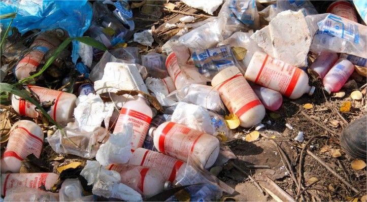 O estado dos frascos, alguns violados e todos vencidos, sugere descarte proposital e clandestino, configurando infração ambiental e sanitária.