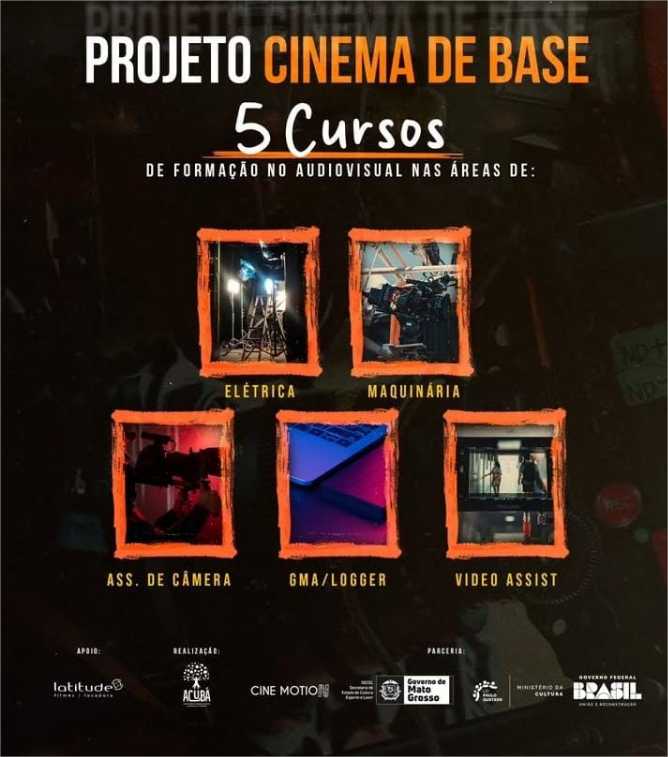 O projeto Cinema de Base faz parte do Edital Nº 16/2023/Secel – Cinemotion/ Edital de formação – Edição Lei Paulo Gustavo e é uma realização da Acubá (Associação Cuiabana Belas Artes), com apoio da Latitude Filmes e Locadora e parceria do Cine Motion MT, Secel-MT (Secretaria de Estado de Cultura, Esporte e Lazer de Mato Grosso) e Ministério da Cultura do Governo Federal.