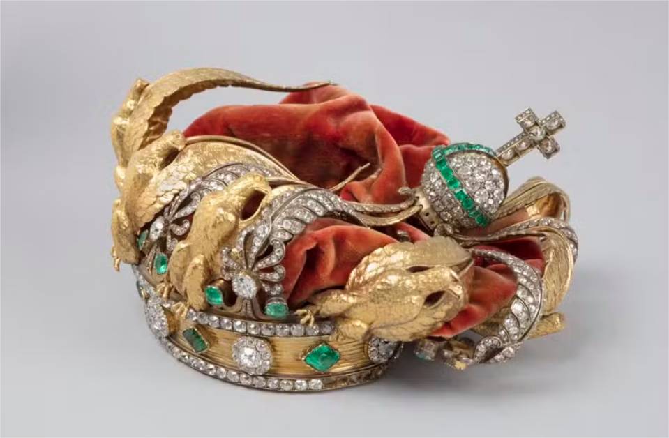A peça é adornada com 56 esmeraldas, 1.354 diamantes e oito águias douradas — símbolo imperial. A boa notícia é que a maior parte da ornamentação da coroa permanece intacta. De acordo com as autoridades do museu, todas as peças mais importantes, como os diamantes e as esmeraldas, ainda estão na sua posição de origem. Apenas pequenos fragmentos de diamante e uma das águias estão desaparecidos.